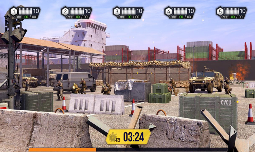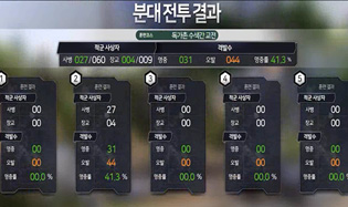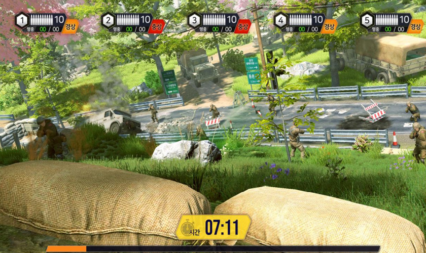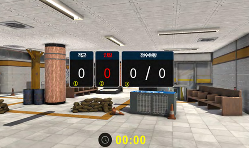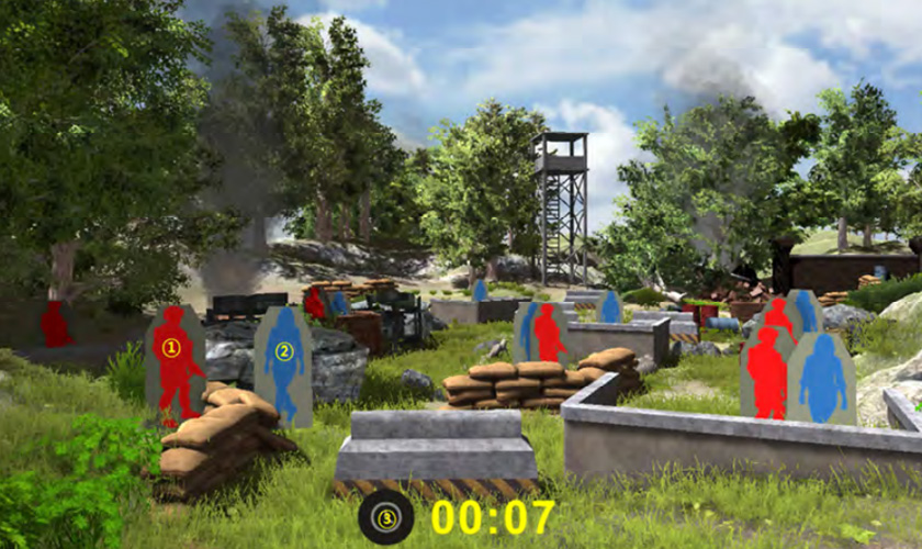 Tactical shooting is a group shooting training that shows various combat training situations and allows combat training with enemies. Difficulty can be selected by adjusting the number of shots and enemy appearances according to the trainee’s proficiency. In addition, if trainee fails to handle the enemy attacking within an appropriate time, the damage to our troops will be expressed as minor-severe-death, and the hit effect will be felt by LED and vibration on the hit-vest.