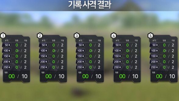 Record shooting is configured to allow shooting training similar to the target shooting environment for each distance. Shooting tow shots for each distance at a shooting distance of 50/100/200/250m. (Training time can be adjusted for each distance)